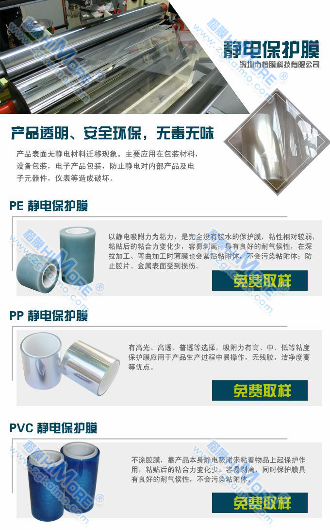 1、不含任何膠粘劑,具有環(huán)境保護(hù),適應(yīng)性好,產(chǎn)品質(zhì)量高等優(yōu)點(diǎn),因此它倍受用戶關(guān)注,被認(rèn)為是今后表面保護(hù)膜生產(chǎn)工藝的發(fā)展方向;